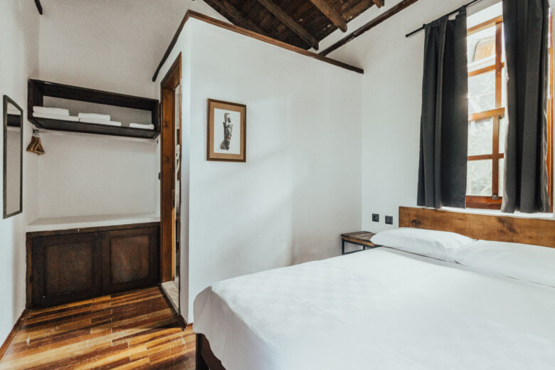 Taş yapıda rahat çift kişilik oda. Elbise askılı büyük dolap. Kişisel bakım ürünleriyle tasarlanmış banyo, küçük detaylar eklenmiş. Bahçe manzaralı.
