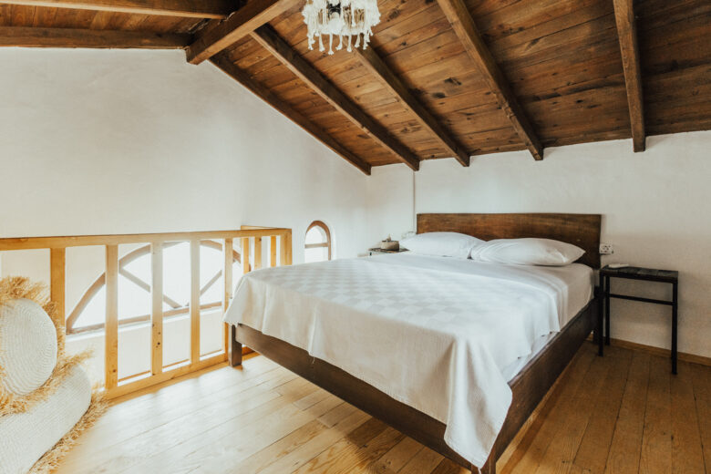 Rahat Çift Kişilik Oda (Mezanin) taş yapıda. Elbise askılı büyük dolap. Yataklı kanepe. Kişisel bakım ürünleriyle tasarlanmış banyo, küçük detaylar eklenmiş. Bahçe manzaralı.