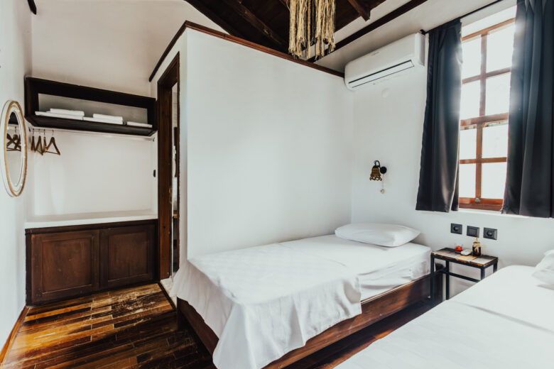 Taş yapıda rahat ikiz yataklı oda. Elbise askılı büyük dolap. Kişisel bakım ürünleriyle tasarlanmış banyo, küçük detaylar eklenmiş. Bahçe manzaralı.