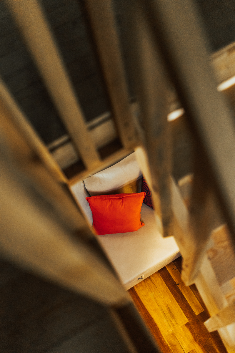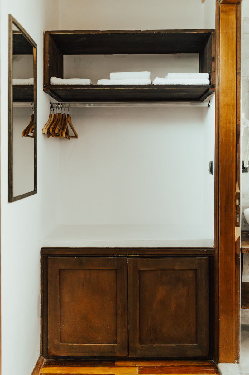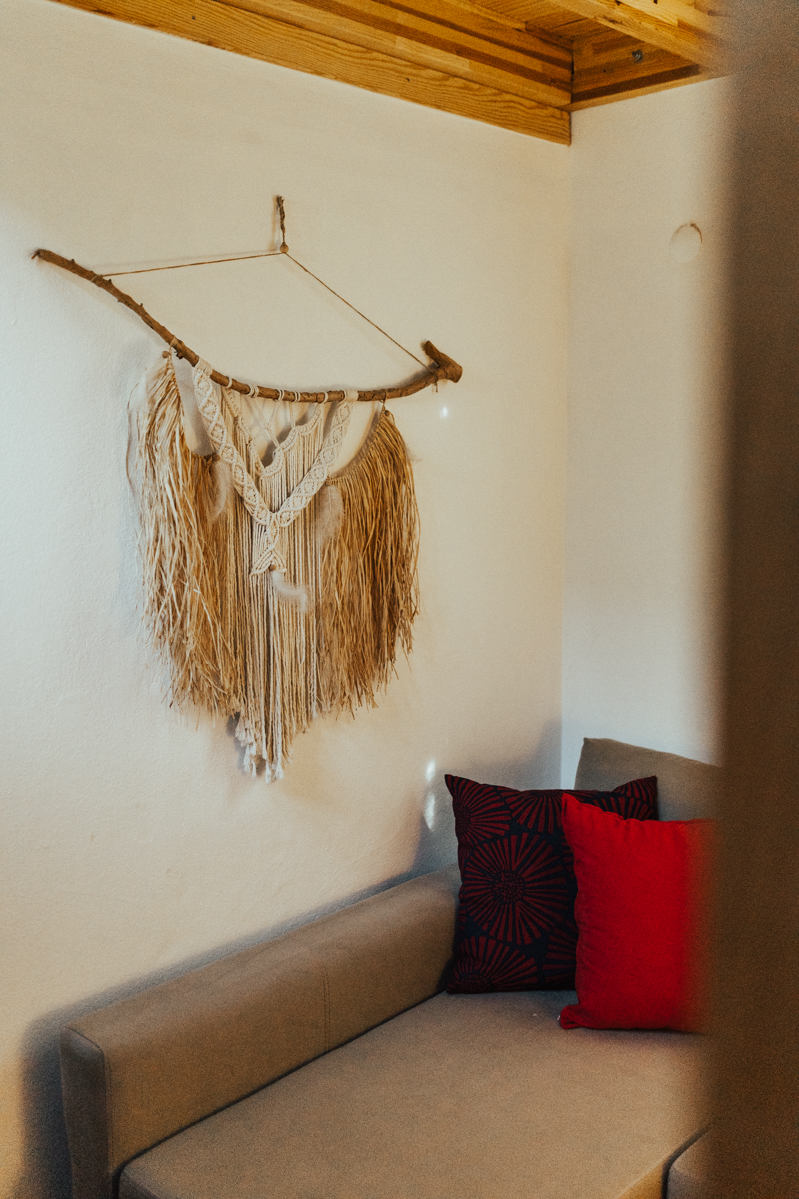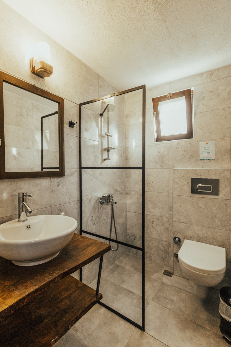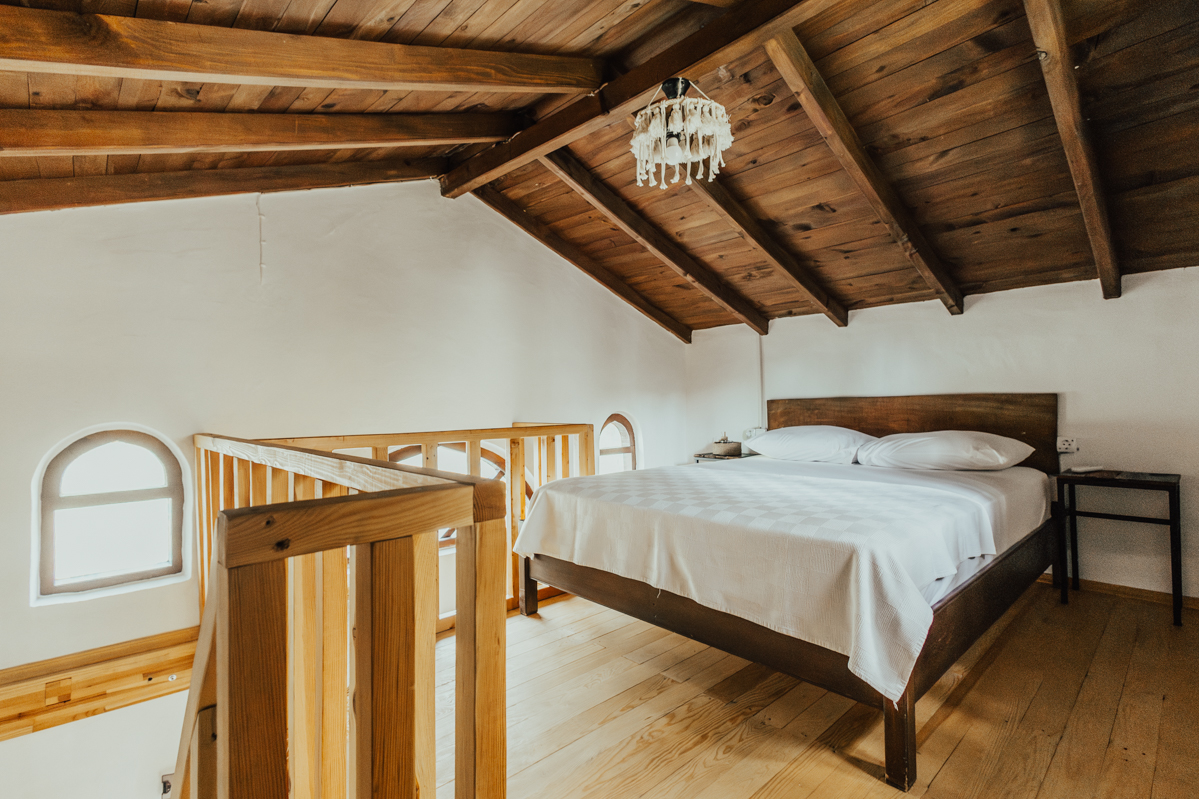 Cozy Double Room ( Mezzanine) in a stone structure. Large Cabinet with cloth hangers. Sofa with bed option. Designed bathroom with personal care products, Small details added. Garden view.