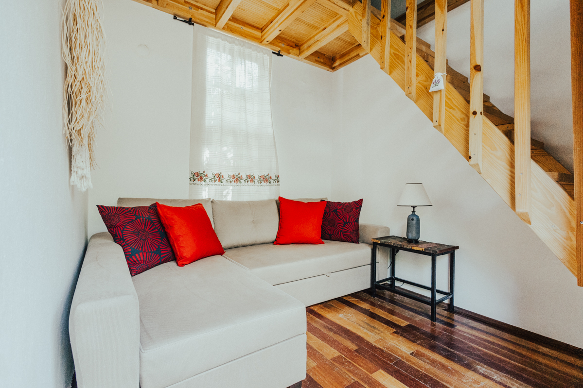 Cozy Double Room ( Mezzanine) in a stone structure. Large Cabinet with cloth hangers. Sofa with bed option. Designed bathroom with personal care products, Small details added. Garden view.